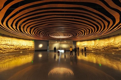 鄭州商代都城遺址博物院坐落于鄭州市市中心,序廳鏤空的洛陽鏟造型,寓意鄭州商代都城是一座由考古發現的千年王都。巨幅環形浮雕講述先商和商代故事。地面投影與年輪頂飾上下呼應,寓意鄭州古今同地,歷史文化一直延續,3600余年的歷史有其根源,數千年的繁華有本可依。