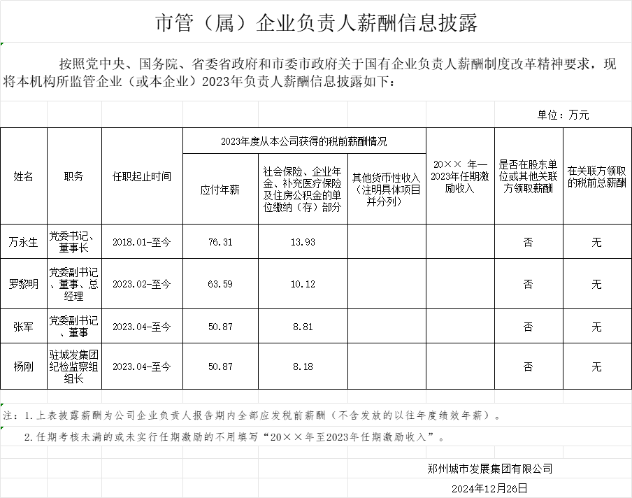 鄭州城市發展集團有限公司2023年企業負責人薪酬情況